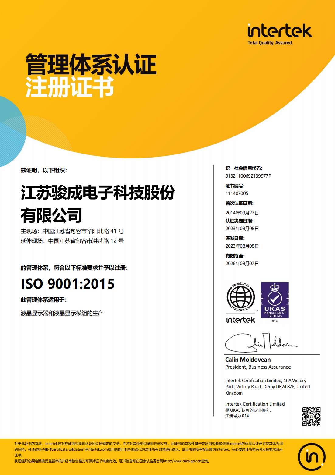 ISO 14001:2015版证书